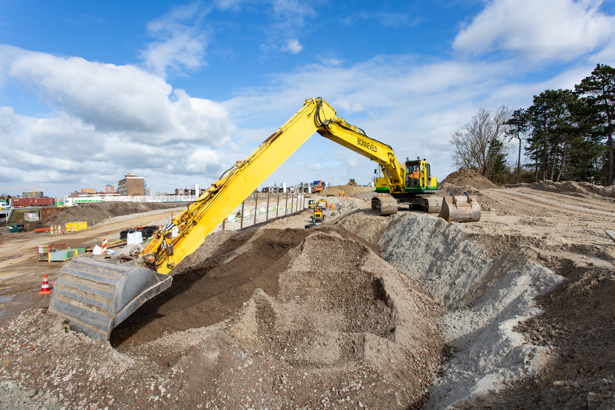 Joosten Concepts partner Geologics verzorgde de dimensionering van de gewapende grondconstructies die een tijdelijk of permanente ontlasting vormen voor (hoofdzakelijk) groenschermen en tunnelelementen. Hiervoor is gebruik gemaakt van Miragrid van Solmax, die prefab is aangeleverd door Joosten Kunststoffen. Uitvoerder Bonneveld bouwt de constructies volgens de legplannen van Geologics.