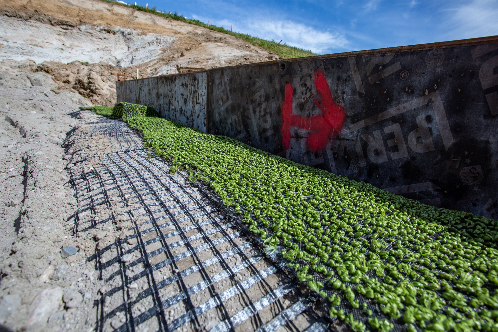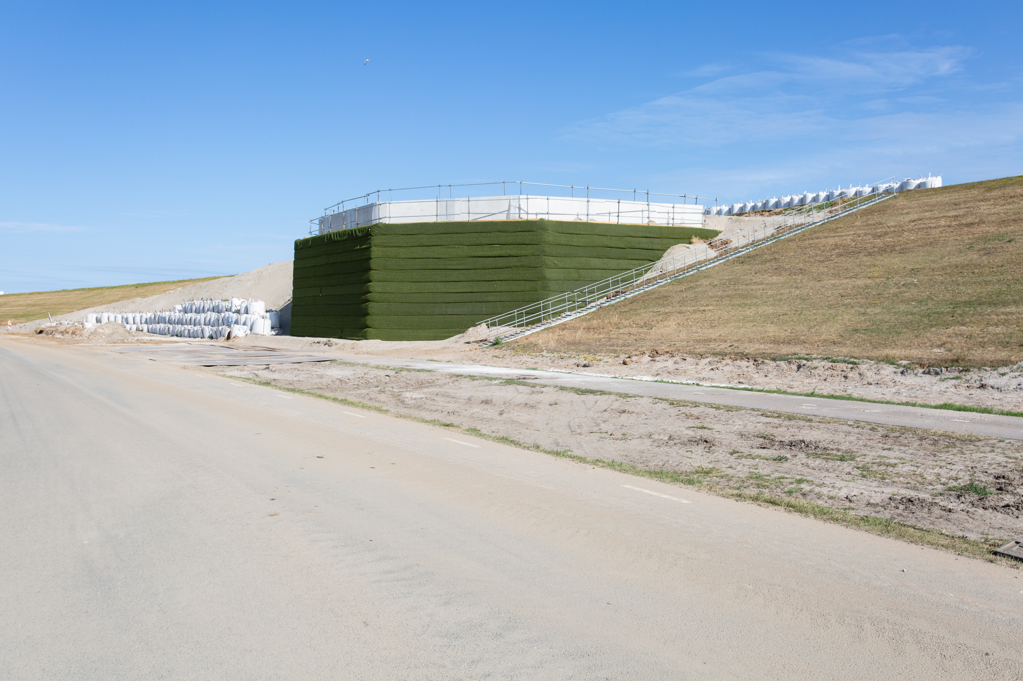 De constructie bestaat uit lagen grond die gescheiden – oftewel gewapend – worden door middel van Miragrid van Solmax. Na het uitleggen van het geogrid brengen wij granulaat aan dat we vervolgens verdichten. Door het grid terug te slaan ontstaat een “matras” en zit het ophoogmateriaal opgesloten. We bouwen verschillende lagen op elkaar tot de ontwerphoogte is bereikt.