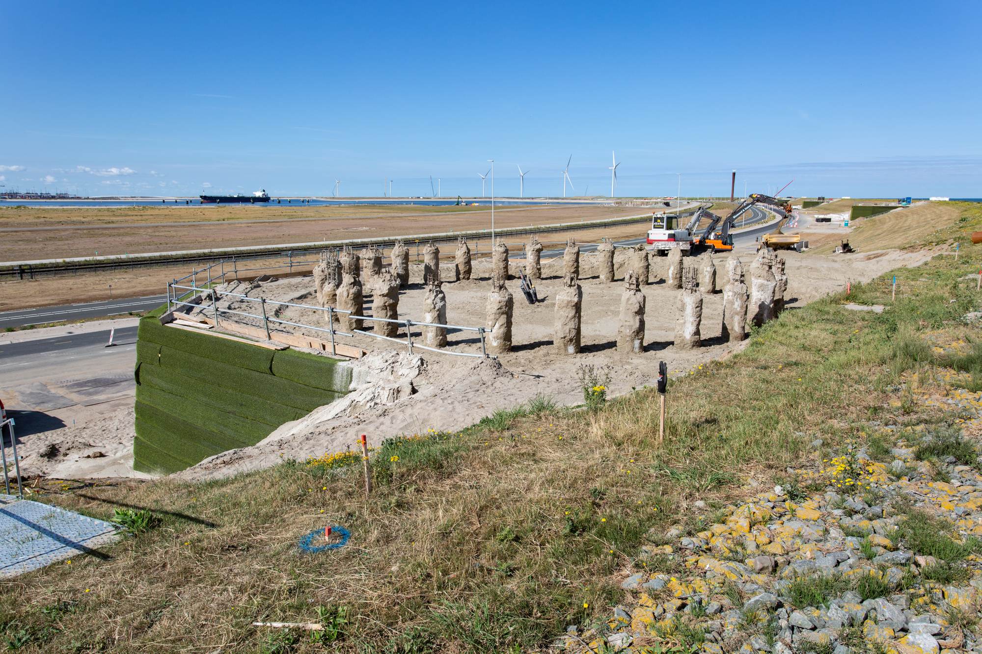 Op de Maasvlakte worden tien windmolens gefundeerd op een zeewering, met een strakke planning buiten het stormseizoen. De fundering is integraal ontworpen om de stabiliteit van de dijk te waarborgen onder statische en dynamische belastingen. Hiervoor zijn gewapende grondconstructies met maatwerkbekisting en geogrids toegepast. Dankzij slimme ontwerpkeuzes is het project efficiënt, duurzaam en visueel passend in de omgeving gerealiseerd.