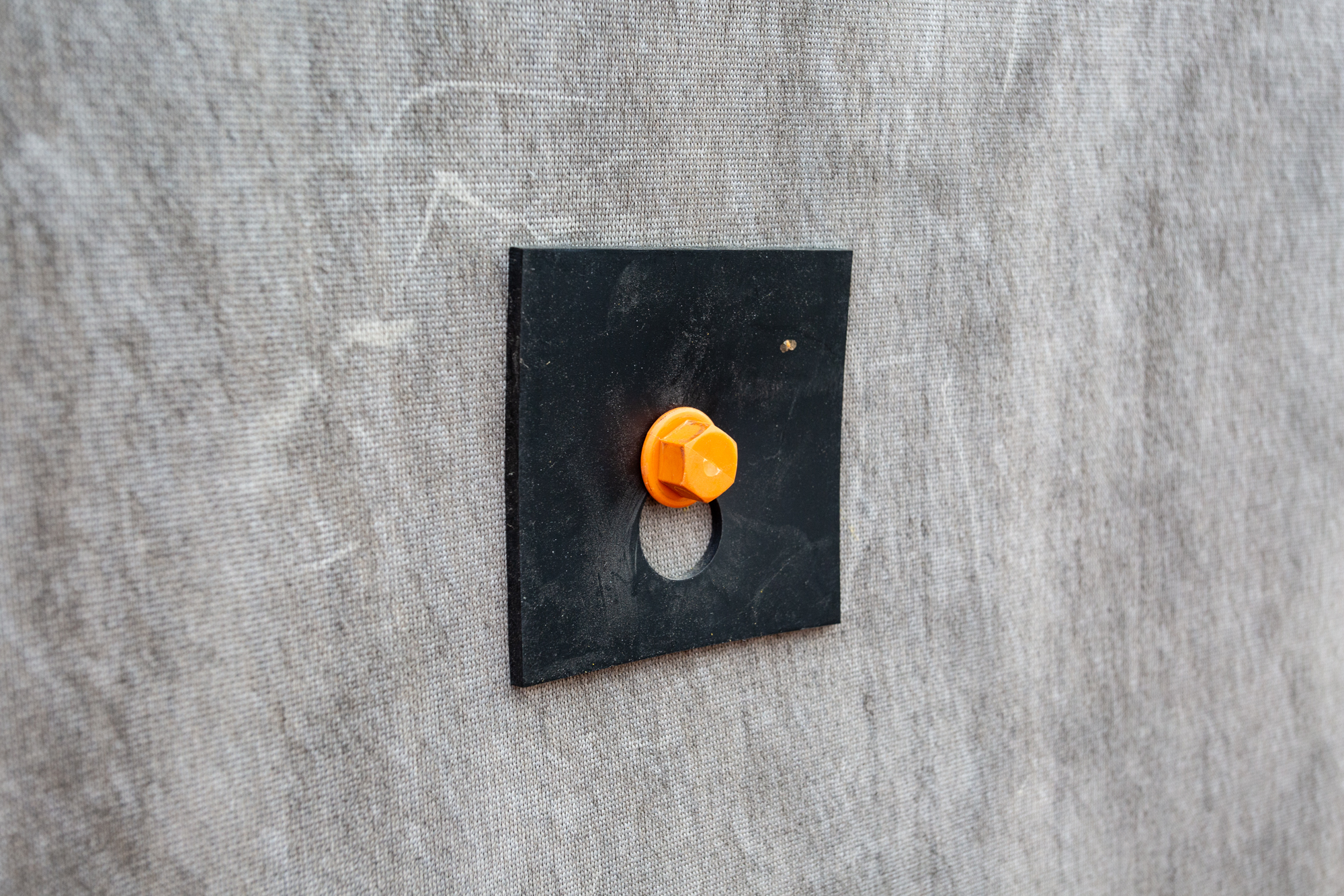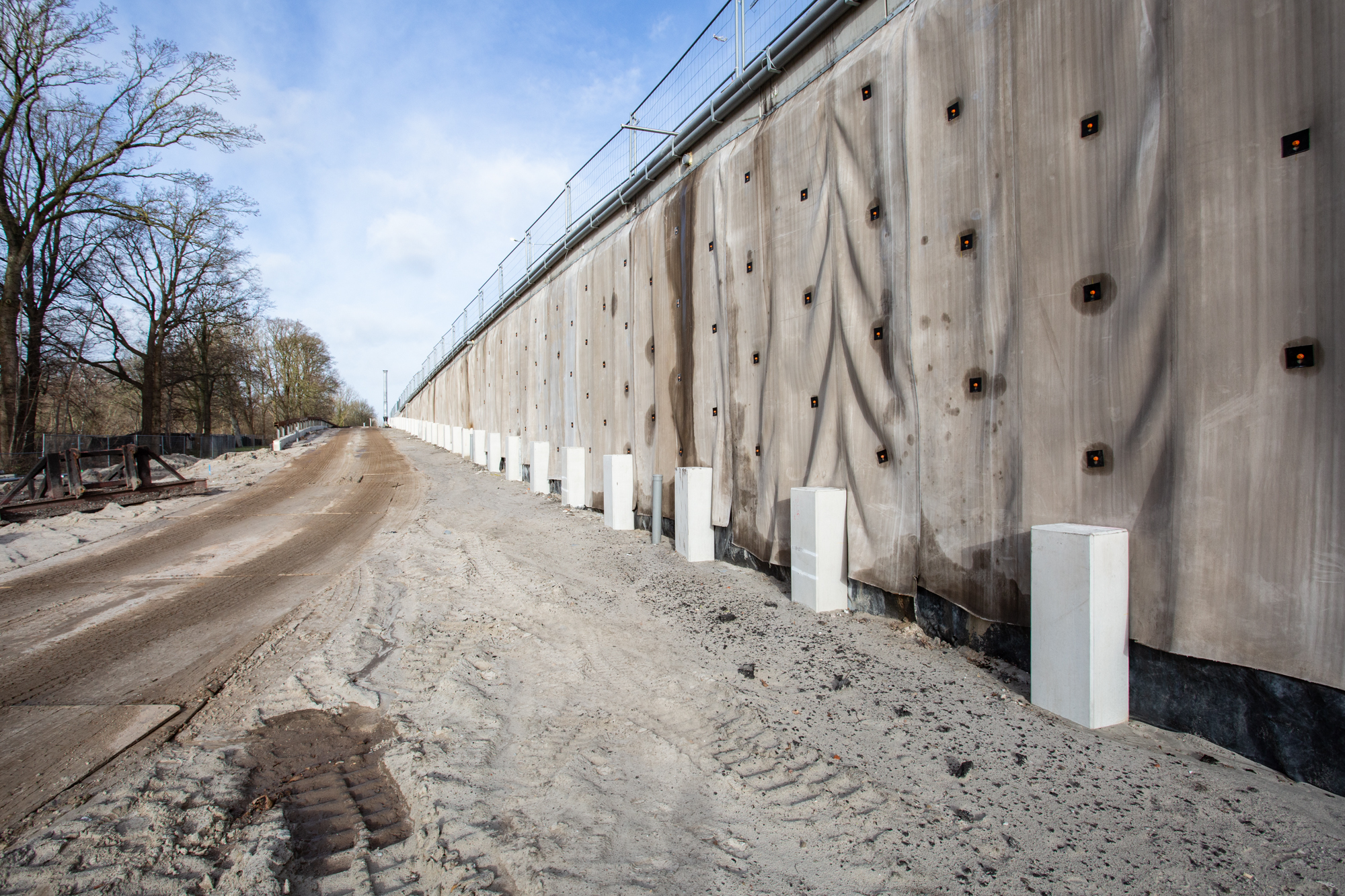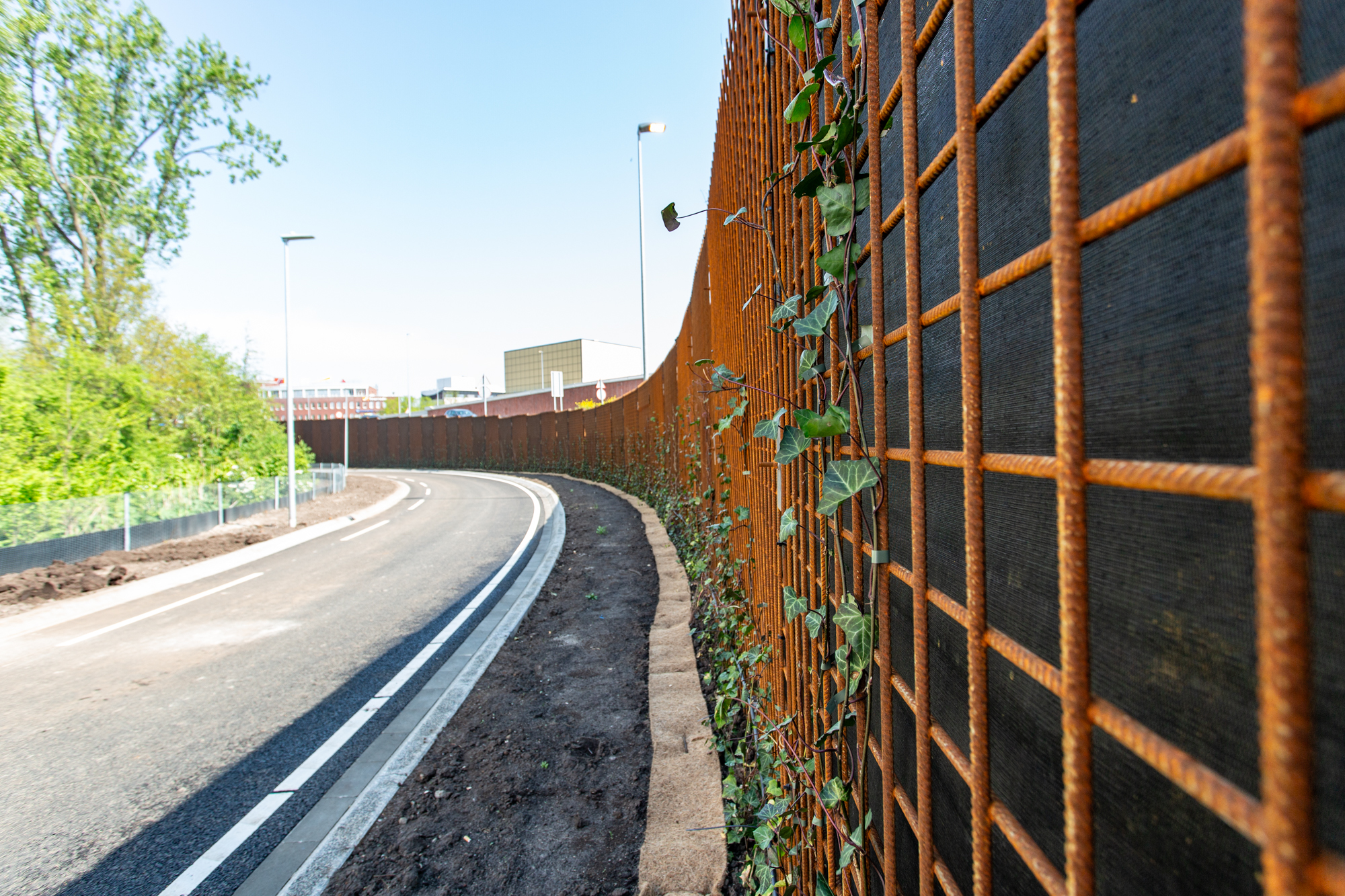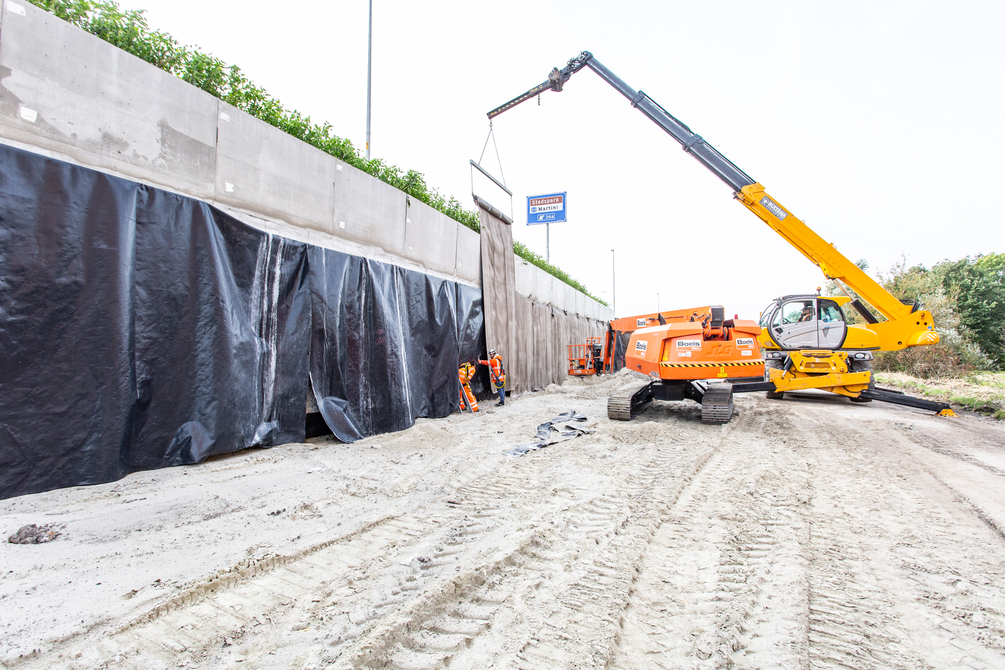 Voor dit specifieke project zijn de CC banen aan de bovenzijde op de betonnen keerwand vastgezet met staalstrips. Om de CC constructie te beschermen tegen windbelasting en de zuigende werking van langsrijdend (vracht)verkeer zijn de banen extra verankerd met, door Joosten ontwikkelde en gecertificeerde, EPS-ankerpennen. Om de EPS-constructie volledig te beschermen zijn de CC banen met folielasapparatuur aan elkaar gelast.