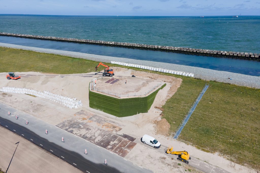 Eerst wordt een stabiele, vlakke fundering gecreëerd waarop de constructie wordt gebouwd. Hiervoor wordt de grond ontgraven tot het aanlegniveau en worden eventueel slappe lagen verwijderd of vervangen door geschikt zand. Op de fundering wordt de wapening van Solmax Miragrid GX geogrid uitgerold, met aan de kerende zijde van de wand een overlengte. Om erosie van het aanvulmateriaal te voorkomen wordt aan voorzijde een gronddicht geotextiel aangebracht. Op het grid wordt een eerste laag zand of menggranulaat aangebracht en zorgvuldig verdicht volgens de richtlijn. Vervolgens wordt de overlengte van het geogrid teruggeslagen, waardoor de grond wordt opgesloten. Door toepassing van meerdere lagen wordt de constructie opgebouwd tot de eindhoogte is bereikt.